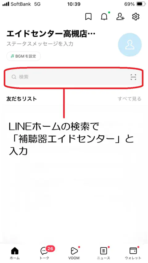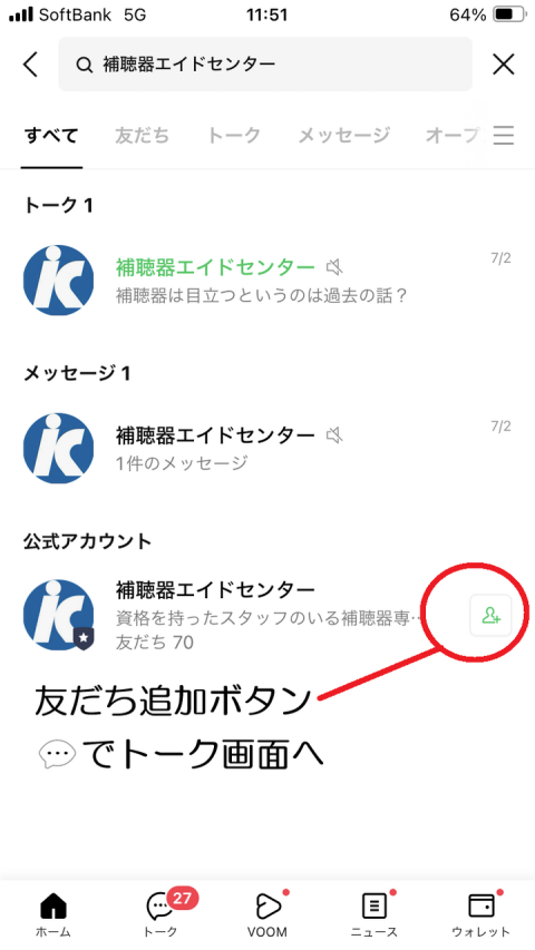 また、LINEホーム画面にて「補聴器エイドセンター」と検索頂いても選択できます!