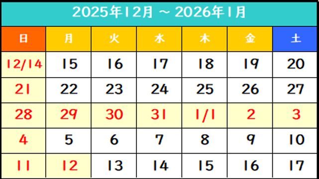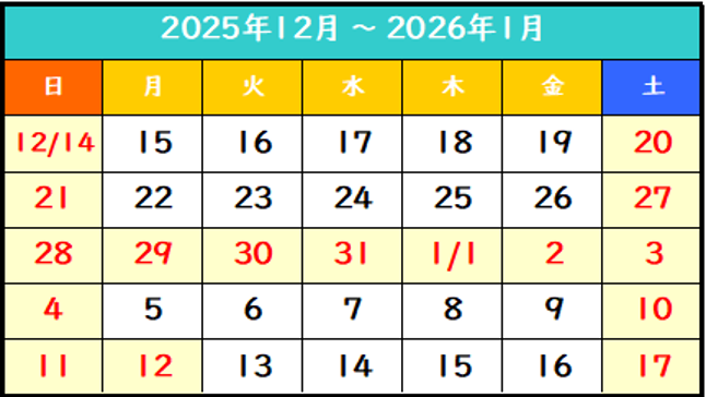 2025年12月28日(日) ~ 2026年1月4日(日) まで